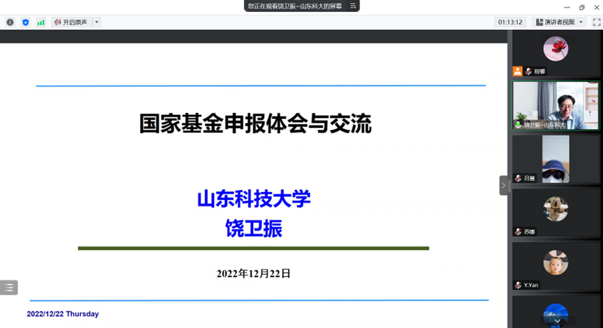 邀请山东科技大学经济管理学院副院长饶卫振教授为我们带来《国家基金项目经验交流报告》的学术讲座。本次讲座由程馨副院长主持,学院教师和研究生在线参会。