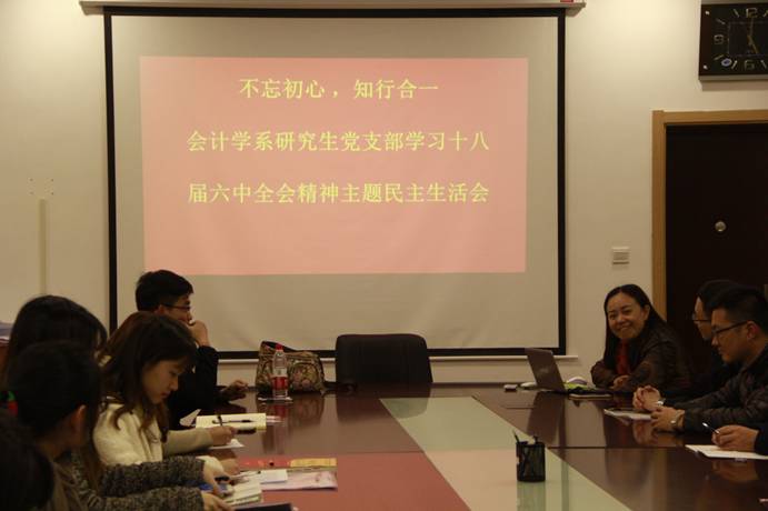 会议以“不忘初心,知行合一”为主题,由会计学系研究生党支部书记陈鑫老师主持,会计学系研究生党员参加了此次会议。会上,党员们主要学习了党的十八届六中全会精神,并就研究生学长学姐的学习、生活经验做了交流和分享。