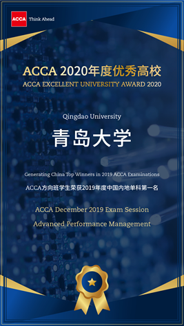 ACCA中国高校一年一度的“全国高校教育峰会”于2020年11月12日在线举行,此次ACCA教育峰会一个重要环节是进行“云”颁奖,表彰2020年度ACCA优秀院校,青岛大学获得“2020年度ACCA优秀院校”的奖项!