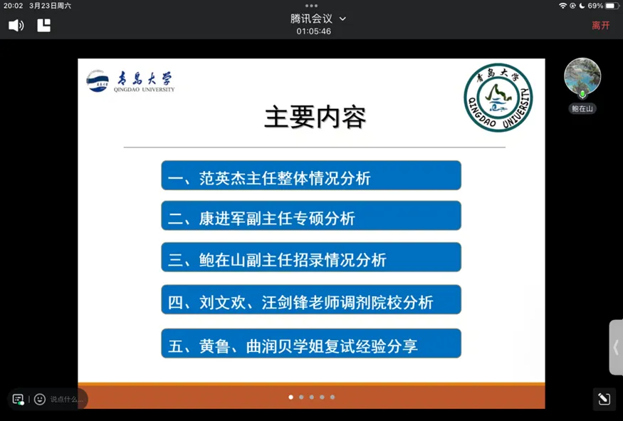 随后,陈鑫老师连线了正在读研的我系优秀校友:中国海洋大学的黄鲁学姐、青岛大学的曲润贝学姐。学姐们从不同的方面真诚而细致地分享了自己的复试经验,并提供了很多有效的方法和搜集信息的途径。学姐们鼓励大家要做好准备、调整好心态,相信自己,不到最后绝不松懈,我系本科生们专业基础扎实,在很多学校的复试中都有优势。