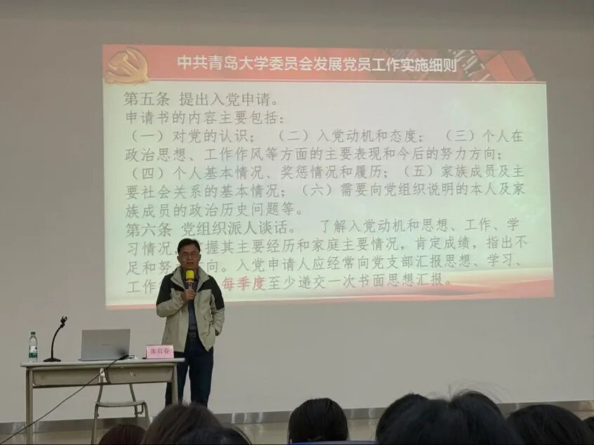 随后,张启春围绕“发展党员工作流程图”展开讲解,清晰梳理了“申请入党→入党积极分子→发展对象→预备党员→正式党员”五个阶段的重点内容,强调入党流程环环相扣、标准严格,同学们要秉持初心踏实向党组织靠拢,这不仅是一份荣誉,更是一份责任。