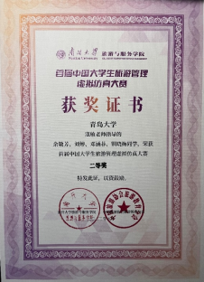 寇敏、刘鸣老师指导,2021级旅游管理专业余敏芳、钏晓梅、刘婷、邓涵菲组成的参赛队伍,经过预赛、复赛、决赛三轮的激烈角逐,最终获得全国二等奖的优异成绩,寇敏老师获优秀指导教师奖。