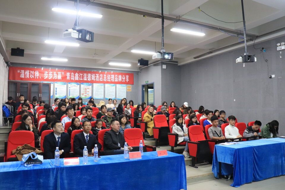 11月30日,旅游与地理科学学院青岛鑫江温德姆酒店总经理品牌分享会于青岛大学浮山校区数字旅游实验室举行。青岛鑫江温德姆酒店总经理张晓东、行政管家杜丹、酒店管理系主任高德宗出席本次活动。2015级酒店管理系全体学生参加了本次活动。