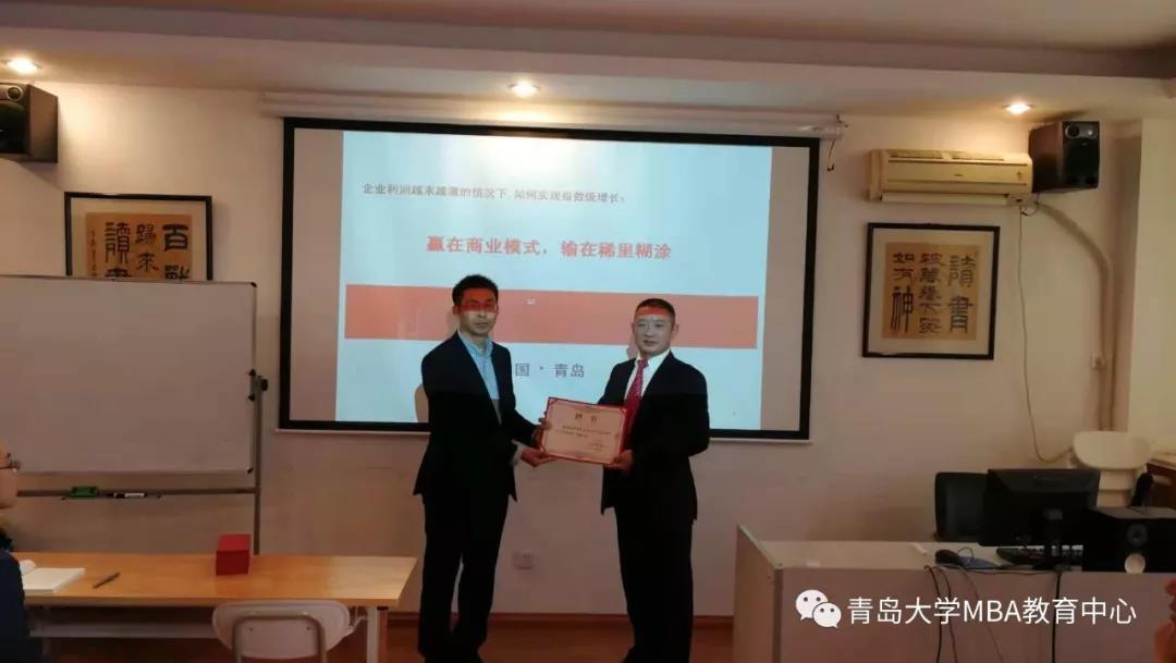 MBA中心副主任李金克教授代表全体同学对罗老师一行的到来表示了热烈欢迎,并为罗老师颁发了青岛大学MBA校外导师聘任证书。