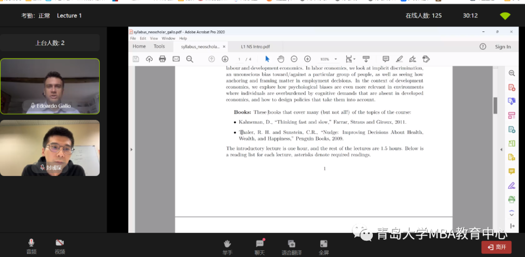 联系中国教育国际交流协会为青岛大学2022、2023级MBA专业同学申请到了两门优质课程学习机会(线上授课),分别是由剑桥大学Edoardo Gallo教授讲授的《人类生活中消费等经济行为的心理学原理-行为经济学导论》和香港科技大学David Hagmann教授讲授的《领导力与组织人才管理-塑造领导力的核心准则》。