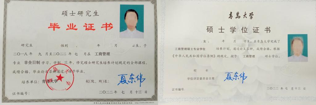 学员修满规定的学分,完成硕士论文并通过论文答辩,经学校审核批准后,授予国家教育部颁发的青岛大学研究生毕业证书和工商管理硕士(MBA)学位证书。